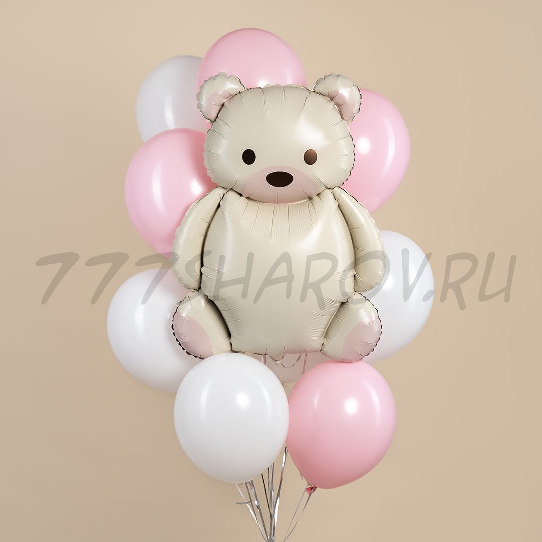 БУКЕТ ШАРОВ "КРЕМОВЫЙ МИШКА" САТИН С ГЕЛИЕМ.