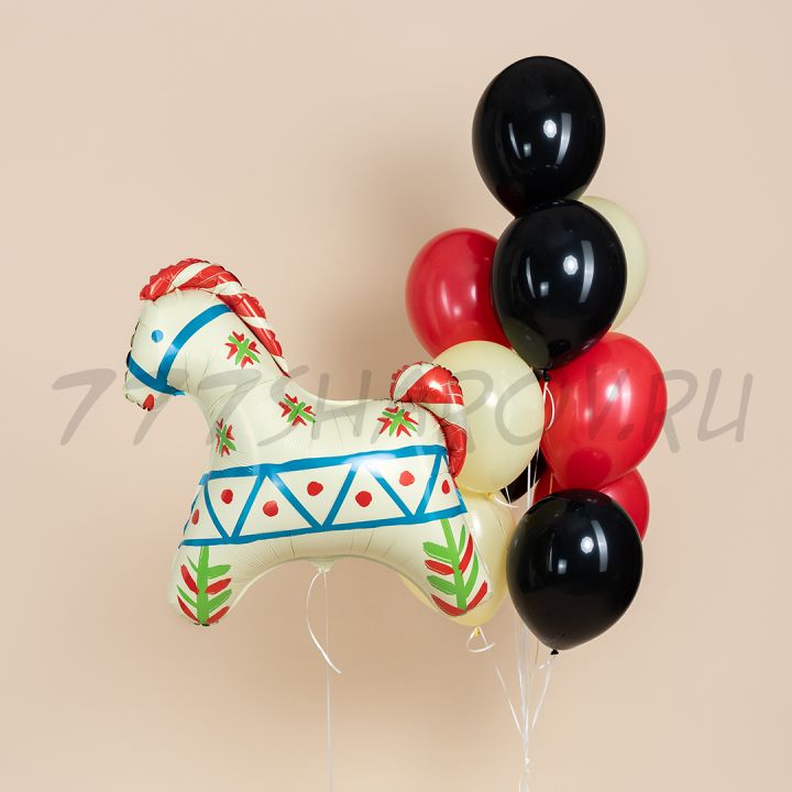 БУКЕТ ВОЗДУШНЫХ ШАРОВ "ЛОШАДКА" РУССКИЙ УЗОР С ГЕЛИЕМ.