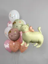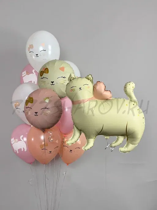 Котиков любят все! А фольгированные фигуры в виде кошечки с бантиком в модных сатиновых тонах отлично подойдет для оформления дня рождения или другого праздника Вашей маленькой принцессы. Мы же с удовольствием подготовим такой фонтан воздушных шаров с гелием и доставим прямо к Вам домой.