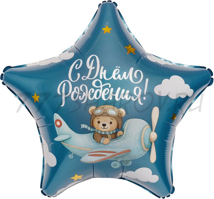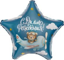 ФОЛЬГИРОВАННАЯ ЗВЕЗДА "С ДНЕМ РОЖДЕНИЯ" МИШКА-ПИЛОТ (18"/46 СМ) С ГЕЛИЕМ